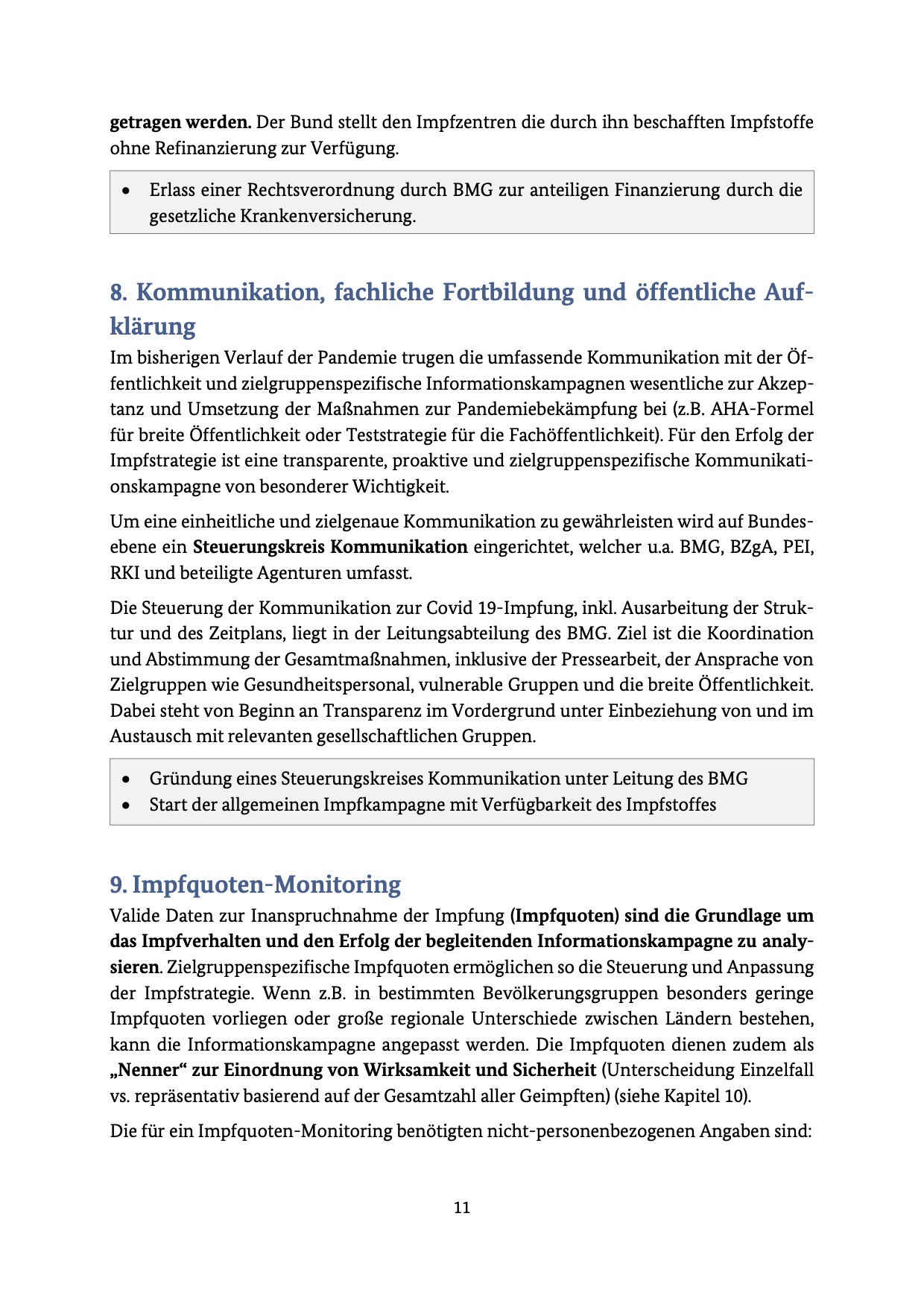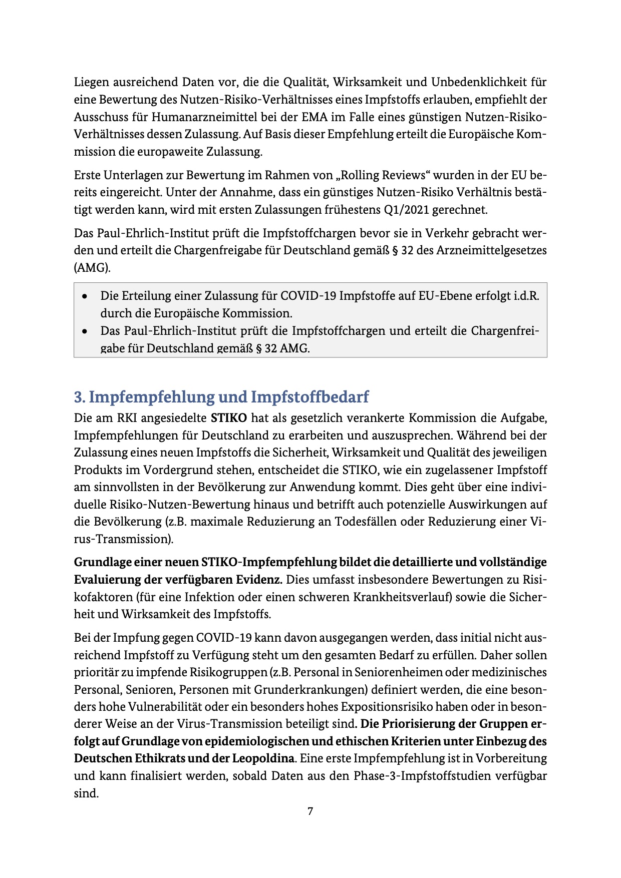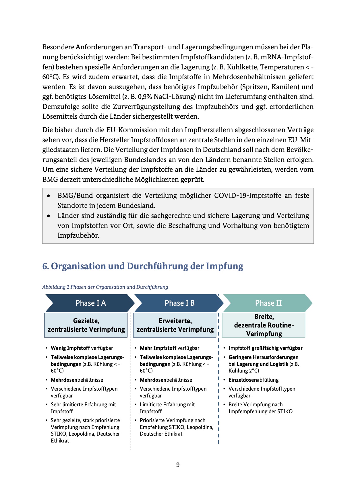 Die Bundesregierung, sowie alle an den Planungen beteiligten Organisationen, planen Senioren und Menschen mit Vorerkrankungen als erstes mit der Immunisierung zu versorgen. Danach folgen Beschäftigte im Gesundheitswesen sowie auch Berufsgruppen wie Polizisten, Feuerwehrleute, und Beschäftige in Lehrberufen.